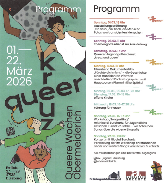 Die „Queeren Wochen Obermeiderich“ laden unter dem Motto „kreuz & queer“ zu einem vielfältigen und inklusiven Programm ein. Zwischen dem 1. und 22. März 2026 finden Veranstaltungen rund um queere Perspektiven, Spiritualität, Kunst, Musik und Begegnung statt – offen für alle Generationen, Lebensrealitäten und Identitäten.
