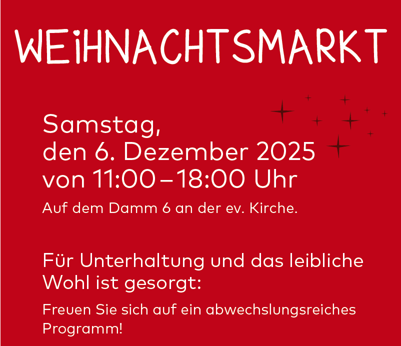 Der Meidericher Bürgerverein lädt herzlich zum 12. Meidericher Weihnachtsmarkt ein!Am Samstag, 6. Dezember 2025, verwandelt sich das Gelände rund um die evangelische Kirche Auf dem Damm in einen festlichen Treffpunkt für die ganze Familie. Von 11:00 bis 18:00 Uhr erwartet die Besucherinnen und Besucher ein buntes, weihnachtliches Angebot mit liebevoll gestalteten Ständen und kulinarischen...